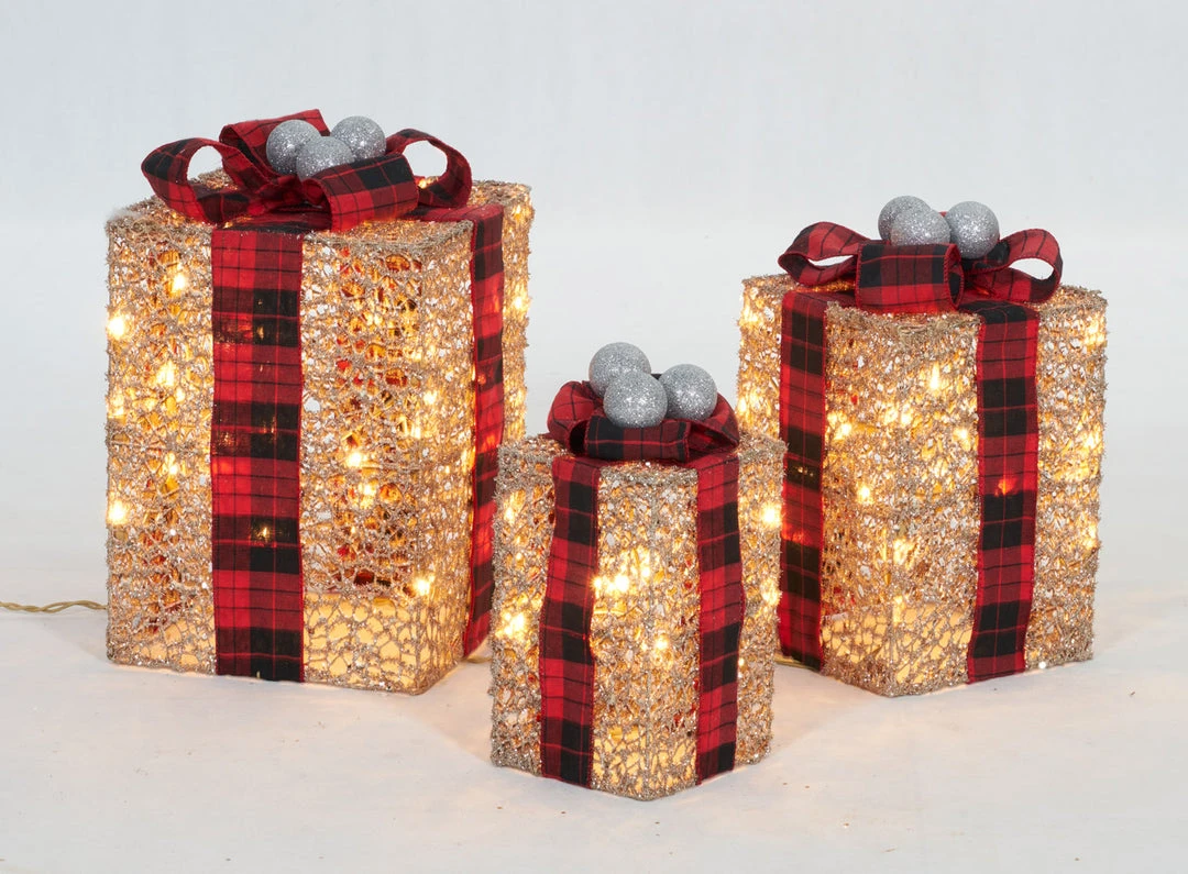 Decorate your home with this charming Set of 3 Gift Box Sculpture! Set is pre-lit with 70 clear, steady-burning bulbs and is designed for indoor and outdoor use.