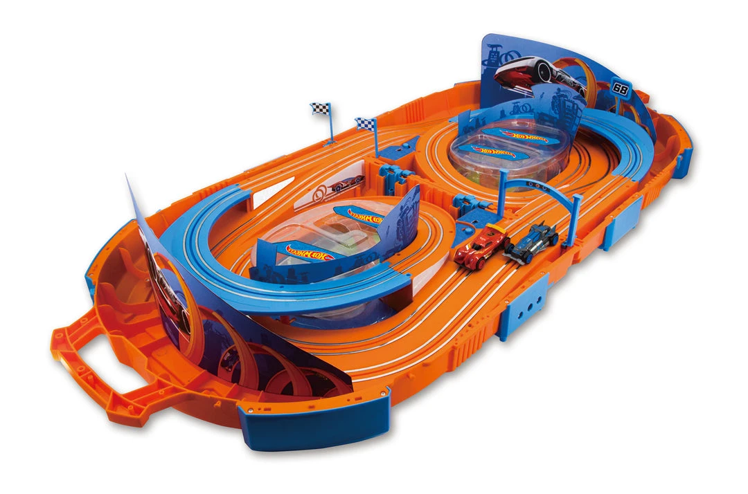 Each set comes with one track set, two 1:64 Hot Wheels slot cars and two wired controllers.